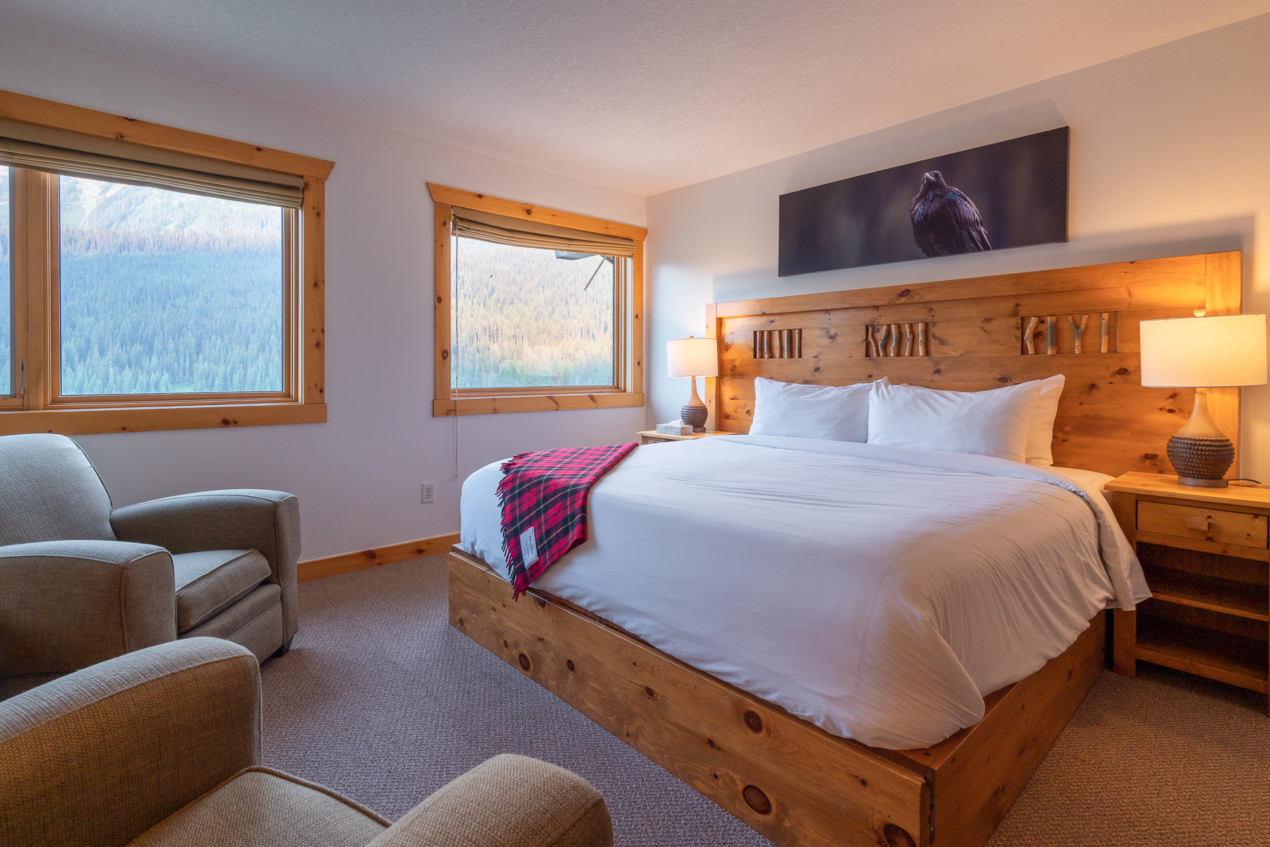 Enjoy stunning mountain views from our cozy lodge rooms & suites, offering a variety of sizes and configurations to suit different needs. Located in the main lodge for convenient access to the restaurant, WiFi, and other amenities, these rooms are perfect for those seeking a classic hotel-like stay with a touch of wilderness charm. Choose from a range of options, including rooms with king-sized beds than can be split into two twins, spacious suites with private balconies and fireplaces (including the pet-friendly Elk Suite), or our cozy Chickadee Room for solo travellers.