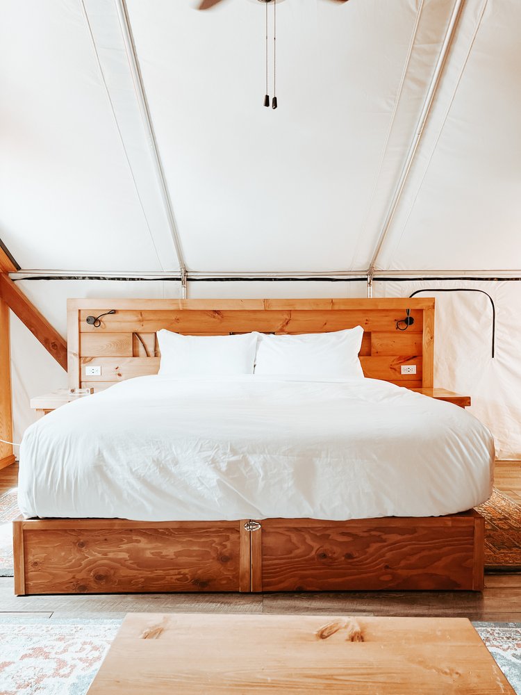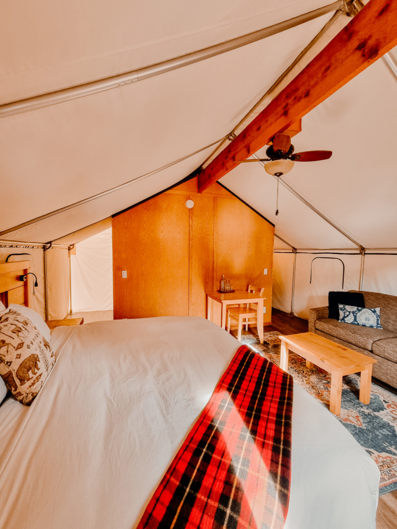 Our glamping tents have flexible configurations depending on your needs. The king-sized bed can be split into two twin beds, there is a pullout sofa bed, plus the ability to accommodate a cot.