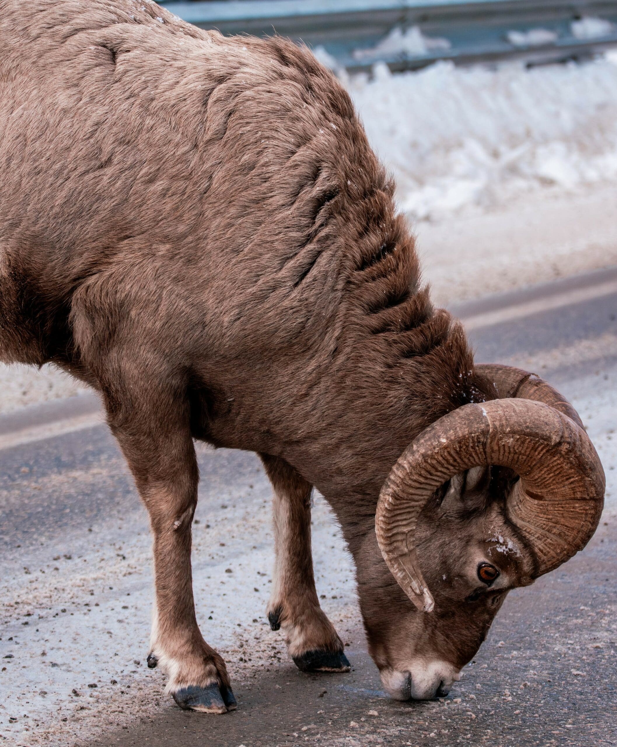 Bighorn sheep are a striking sight in the Kananaskis region, often seen navigating the rugged cliffs and steep mountain slopes with ease. They are also often seen on Highway 40 licking salt off the side of the highway!
